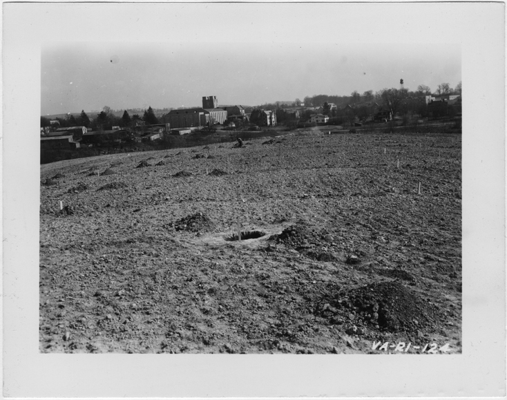 General view of stakes and planting operations on new peach orchard. This is the first VPI orchard established on the contour