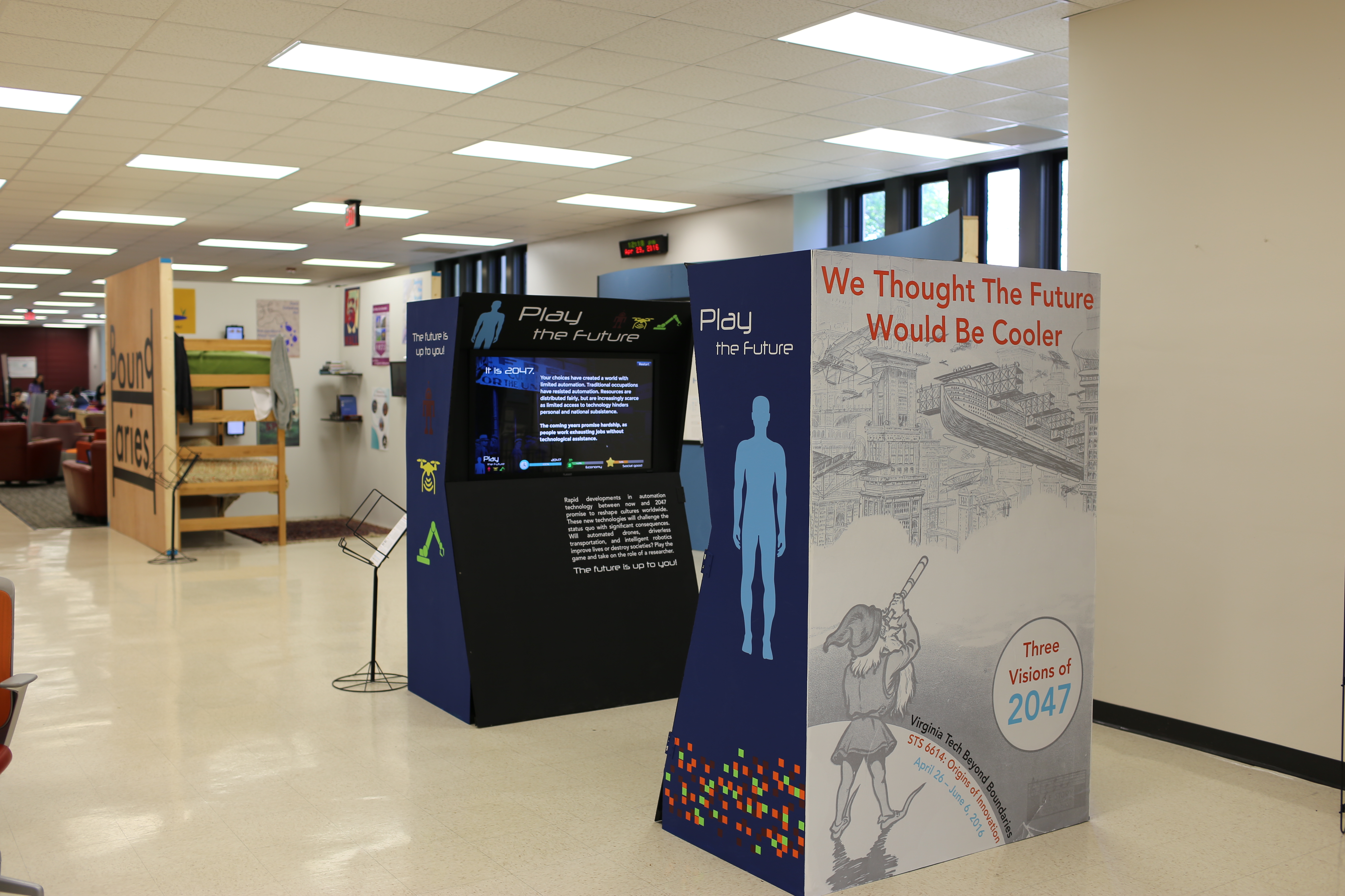 Interactive installation in which students from a transdisciplinary collaboration commandeer the challenge of Virginia Tech’s university-wide Beyond Boundaries initiative. The exhibit explores Virginia Tech’s possible futures, but also questions who has a say in imagining them, and to what ends. The project results from STS 6614: Origins of Innovation, a seminar that challenges our beliefs about, and our participation in, innovation. 2016/04/26 - 2016/06/06