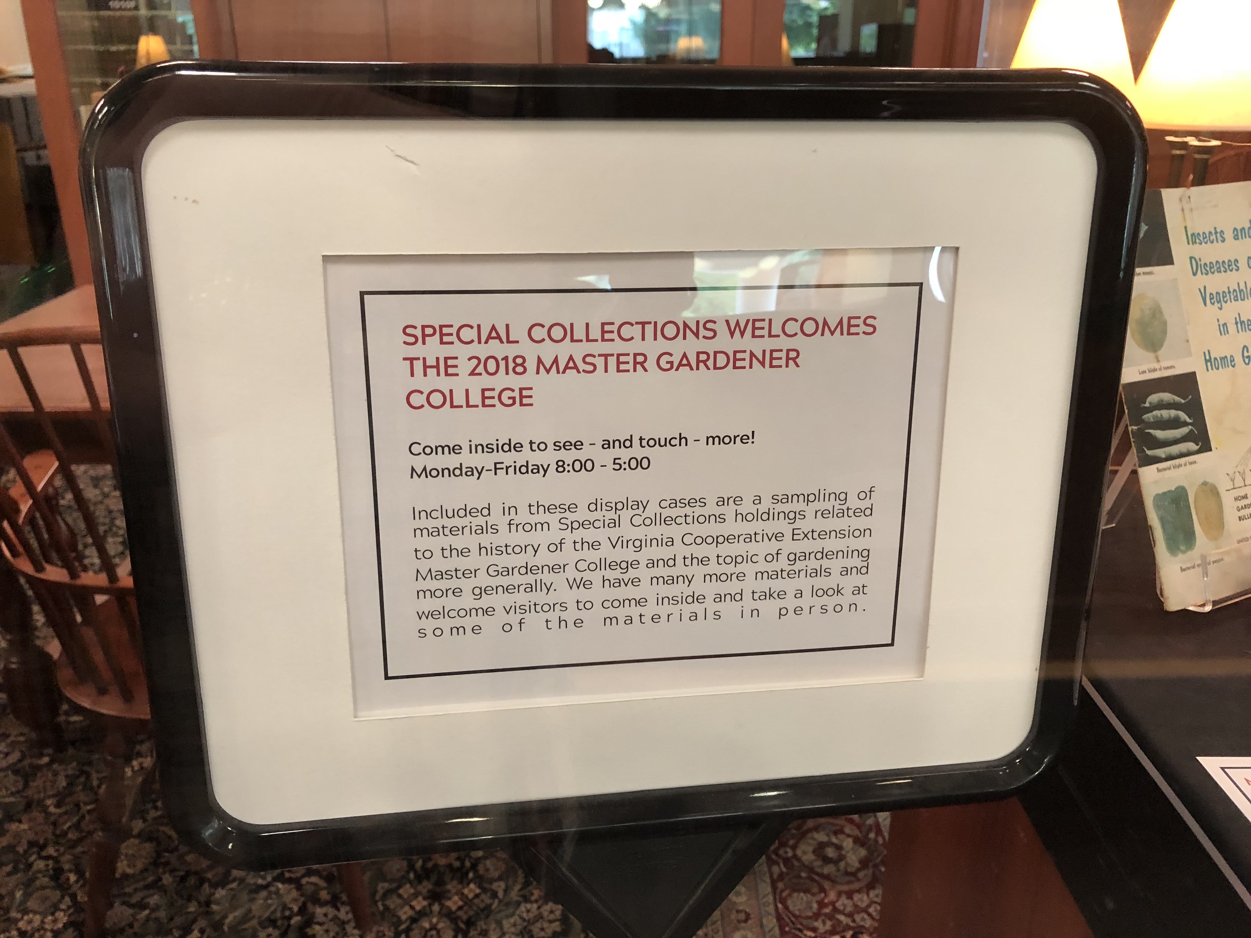 | dc.description.abstract | Exhibits curated to support the Master Gardener Program in June 2018. A book display with materials related to the program's sessions was on display for a week in the main library. An exhibit of archival material was on display for approximately 3 months in Special Collections. | en |