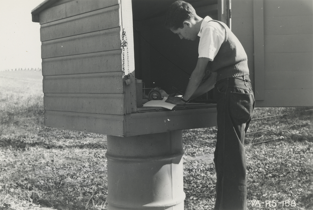 View showing man changing chart at instrument shelter on Blacksburg W-III.
