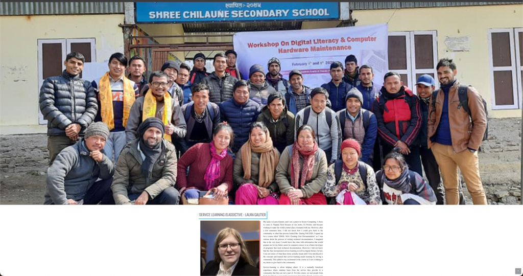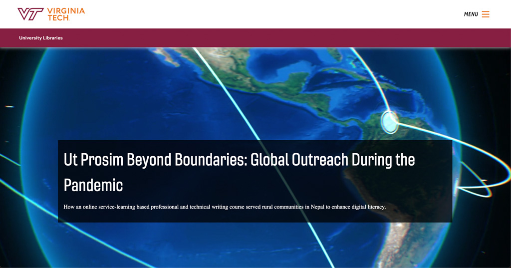 "Ut Prosim Beyond Boundaries: Global Outreach During the Pandemic" is an exhibition curated by Dr. Sweta Baniya, Laura Gautier, and Scott Fralin to present an example of Virginia Tech’s motto Ut Prosim in action. In this exhibition, we curate our experiences of an online service-learning-based Professional and Technical writing course at the Department of English that aimed at serving rural communities in Nepal to enhance digital literacy. This exhibition curates the multimodal and digital works produced by the students, including their reflections on learning from the partnership. The exhibition will also illustrate the stories and experiences of Dr. Sweta Baniya, her student Laura Gautier, and the community partner Ravi Kumar. The students created a varied range of user documentations, mobile application prototypes, and web interfaces that focused on empowering the rural population by enhancing digital literacy in post-pandemic Nepal. Below we share information on the class followed by our reflections, along with student experiences.