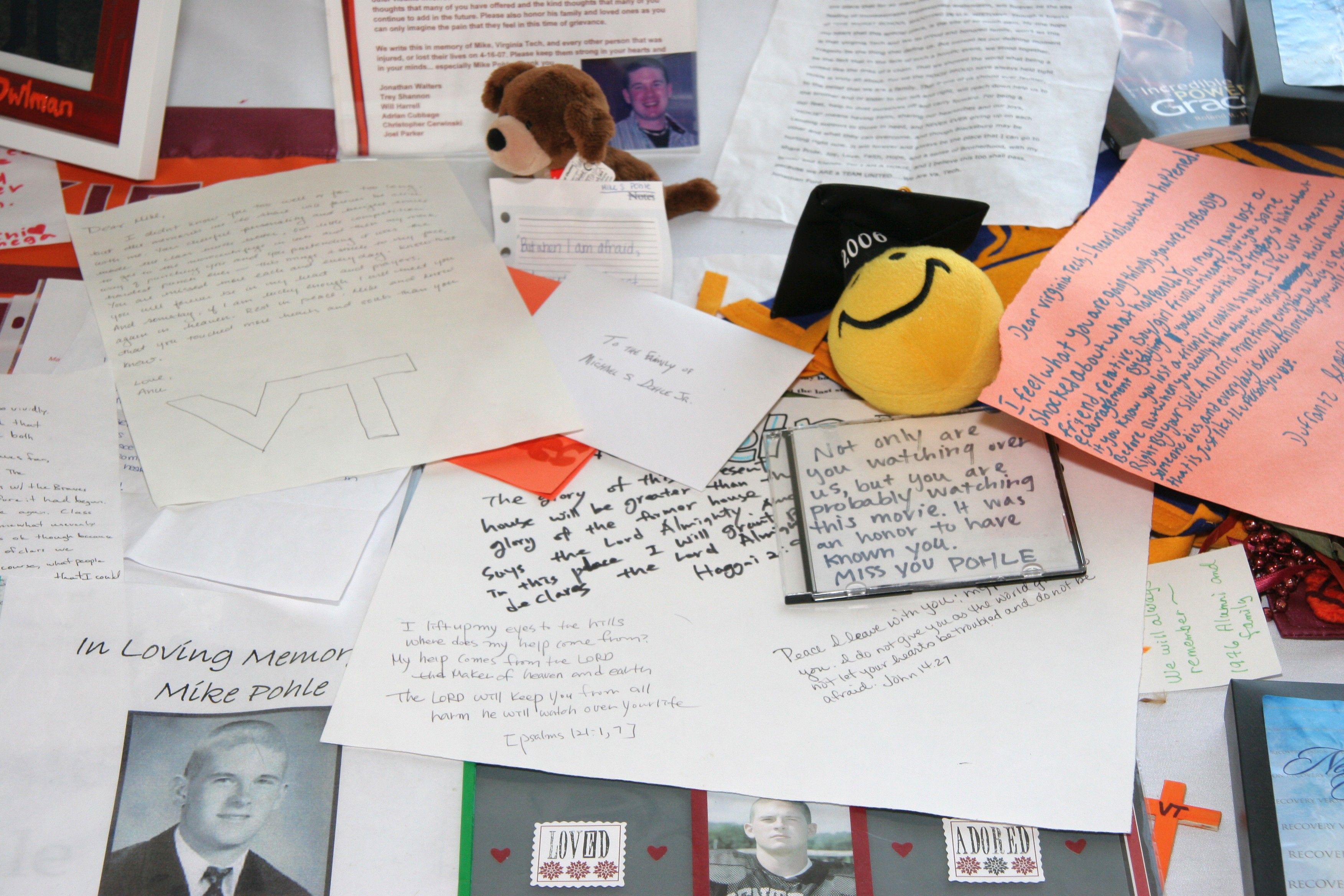 Virginia Tech, Virginia -- Blacksburg, Drillfield, Pohle, Michael Steven, Jr., Stuffed animals (Toys), Condolence notes