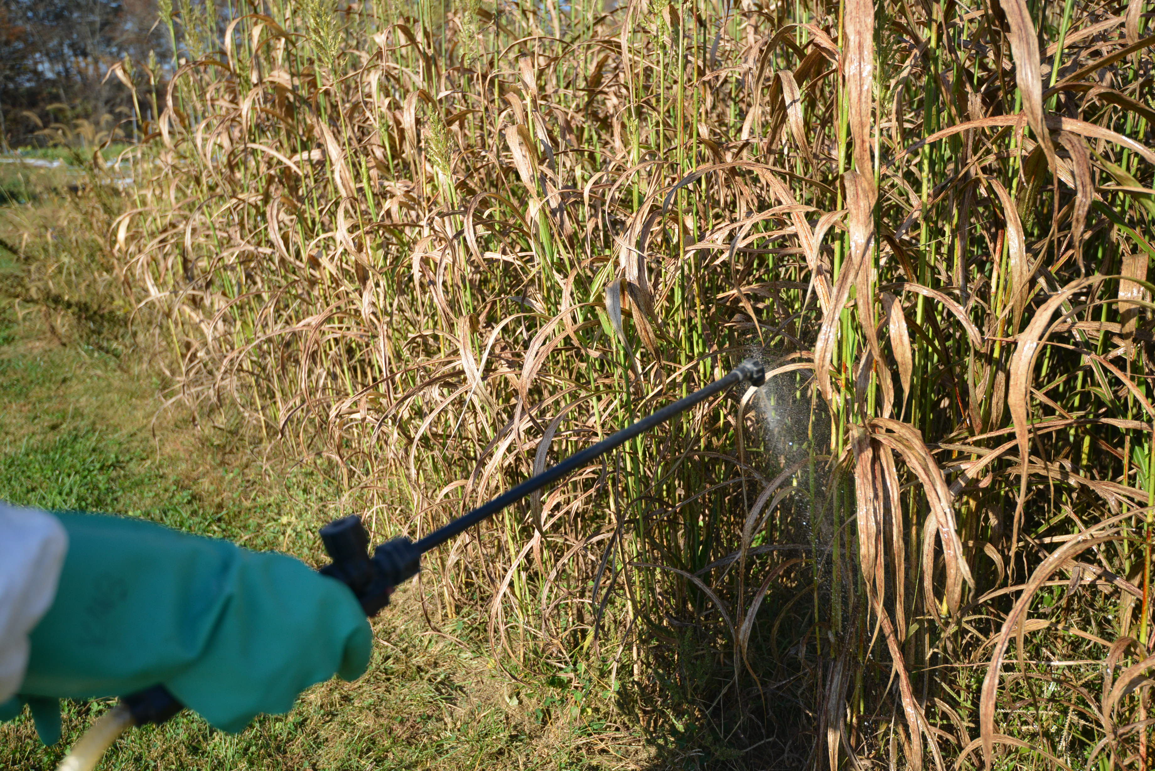 Close up of the wand of a backpack sprayer, applying a spray to corn. The applicator is wearing nitrile gloves. You can see different droplet sizes coming out of the nozzle of the sprayer.