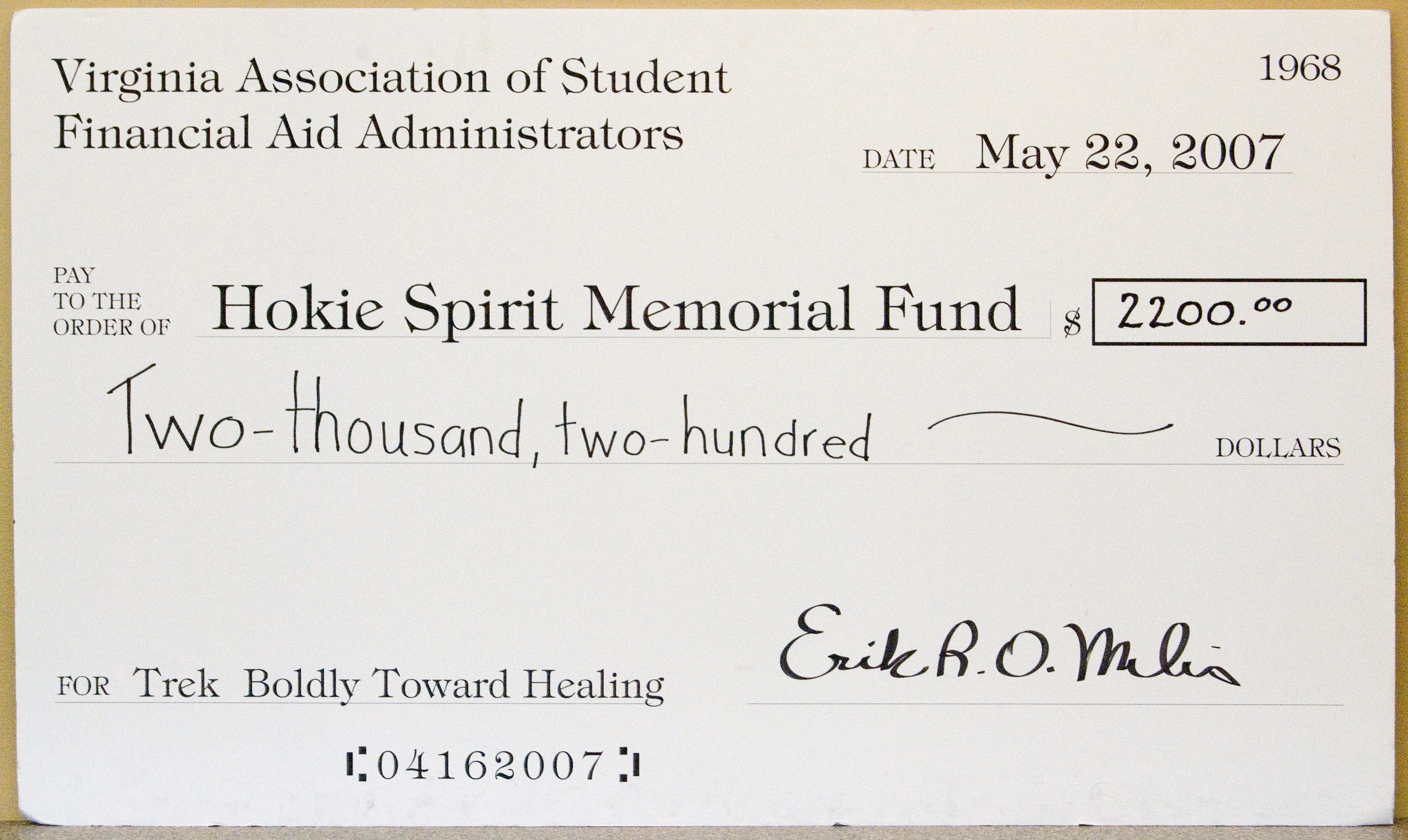 Poster copy of a large check from the Virginia Association of Student Financial Aid Administrators