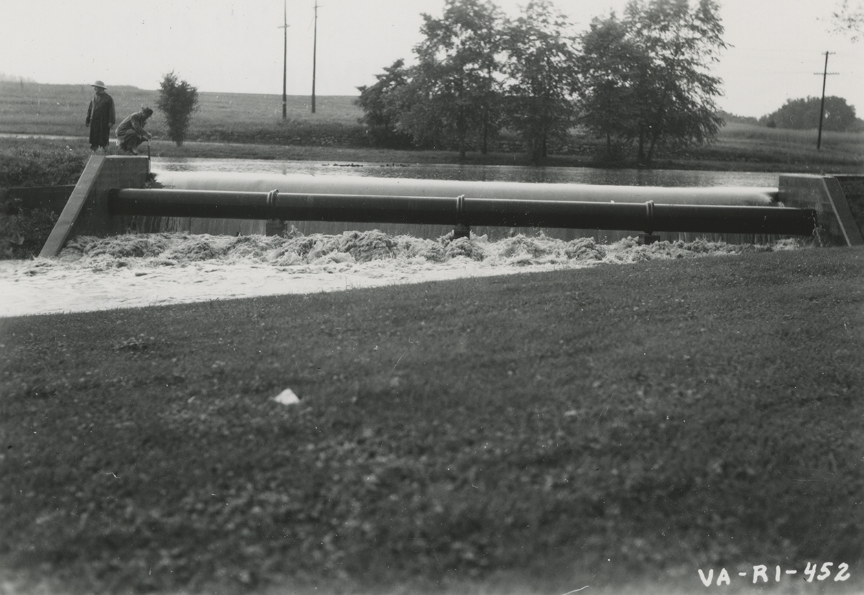 View of flood runoff over dam on Strubel's (Stroubles) Creek at lower end of campus. This occurred at 2:40 p.m. following a rainfall of 2.35".
