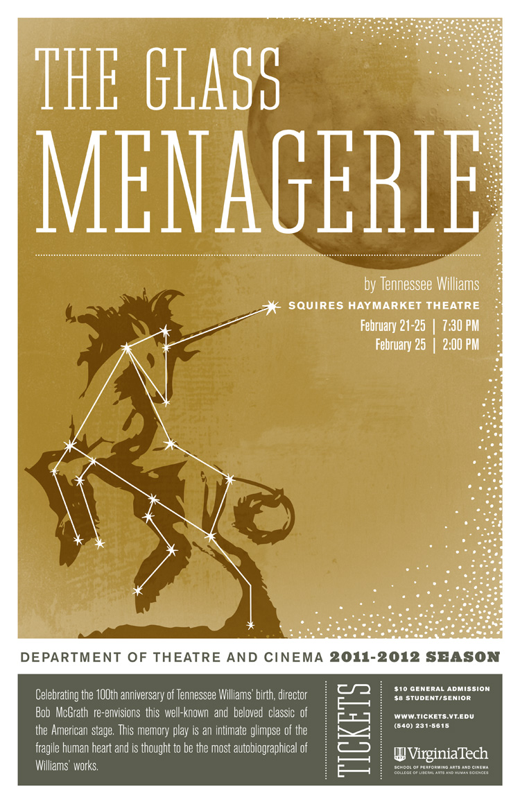Poster for a production of Tennessee Williams' "The Glass Menagerie," directed by Bob McGrath and produced at Virginia Tech's Squires Haymarket Theatre for the 2011-2012 season.
