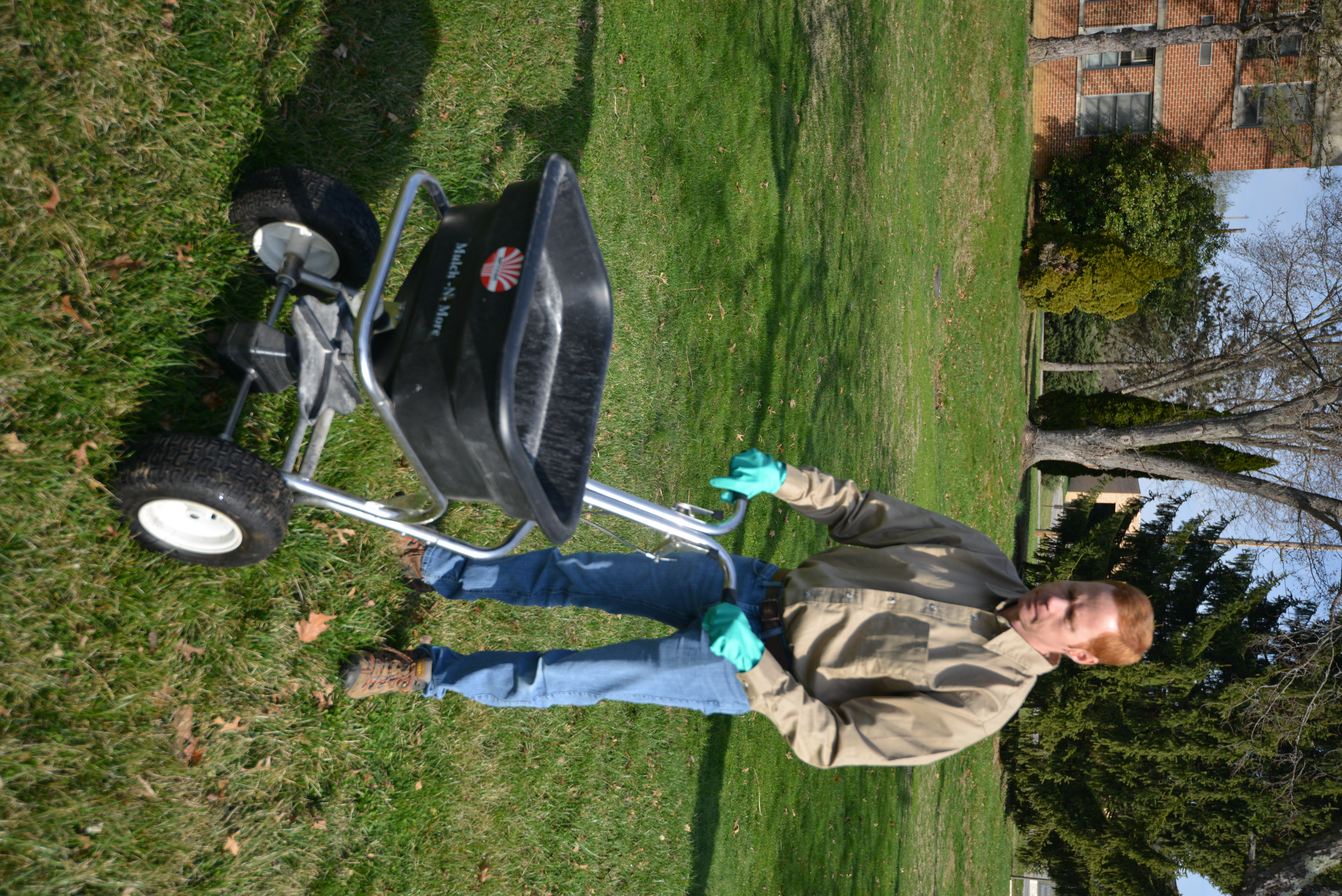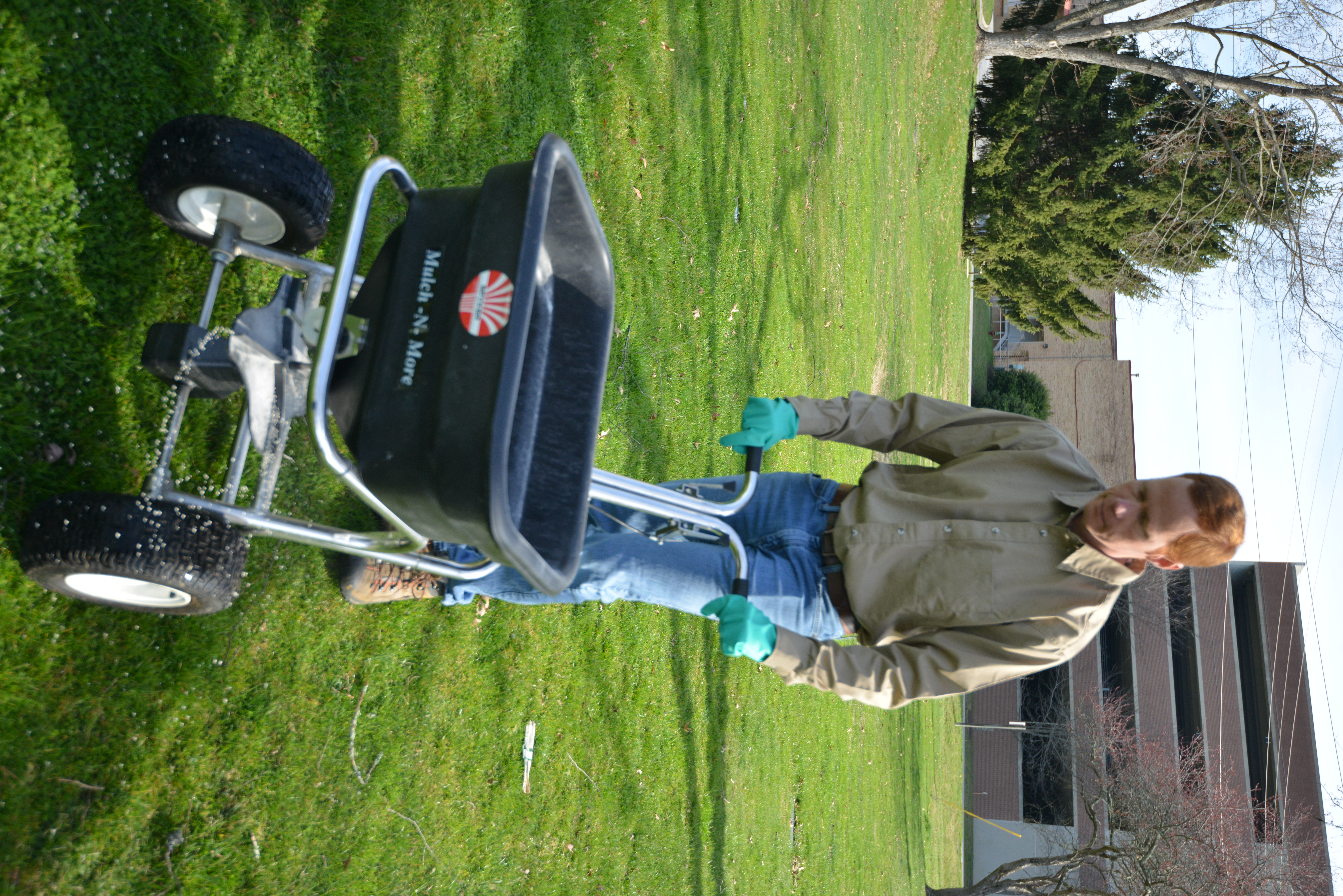 An applicator is operating a Mulch-N-More Rotary Spreader on turf. The applicator is wearing green nitrile gloves.